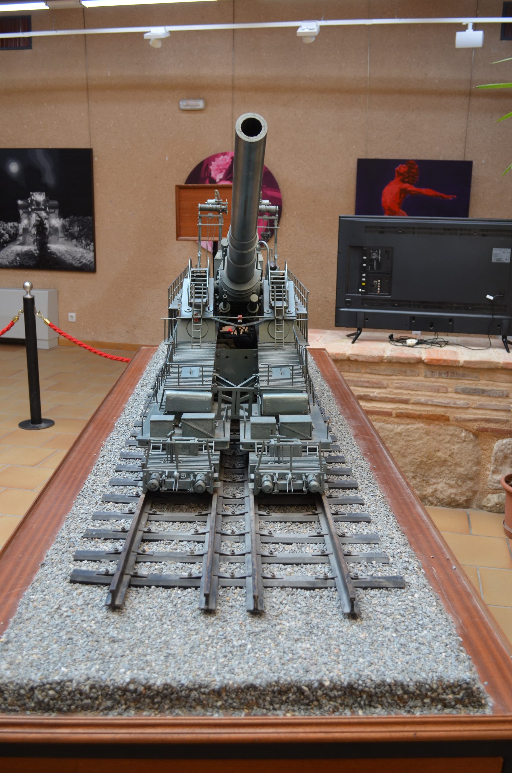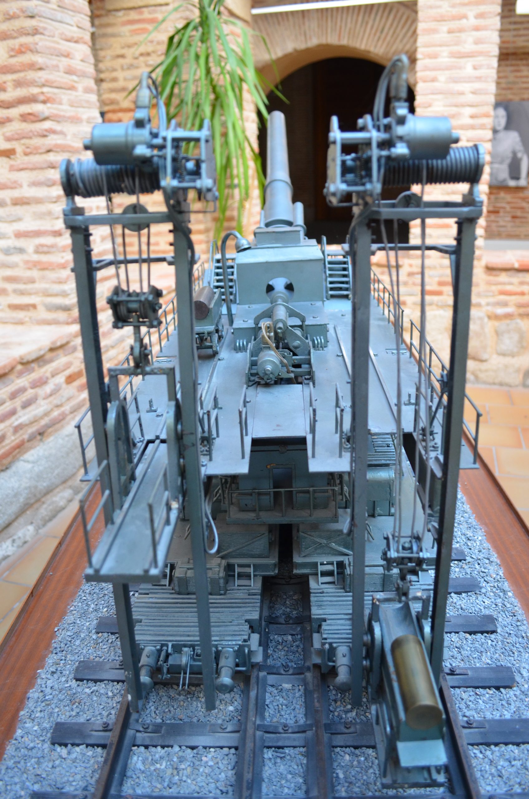 La primera pieza no pudo entregarse en 1.940, como se había solicitado, pero si en el verano de 1.941. siguiendo la tradición de la artillería pesada ferroviaria alemana, esta pieza fue bautizada con el nombre de Gustav Gerät (Pesado Gustavo). El segundo y último ejemplar recibía el nombre de “Dora”. Hasta principios de 1.942 no fue posible terminar la construcción de la dotación y para entonces el objetivo que debía haber batido la Maginot, ya había caído y también la Linia Stalin. Se habló de despacharla en apoyo de las tropas destinadas al asalto de Gibraltar, pero la operación “Félix” nunca llegó a consensuarse. Su primera acción de guerra fue la de Sebastopol, como se ha dicho. La gigantesca mole se apoyaba sobre 4 vagones plataforma gemelos de 10 ejes cada uno, es decir, un total de 80 ruedas rodando sobre 2 vías paralelas. Los montajes eran de diseño ortodoxo e incluían una cureña de vigas de cajón sobre los vagones anteriores. Encima se montaban el afuste, los muñones, la cuna y por último el tubo. Para viajar, las partes superiores se desmontaban mediante grúas y se cargaban sobre los transportes. La cureña se dividía longitudinalmente para formar dos semicureñas, cada una en un ancho de vía.