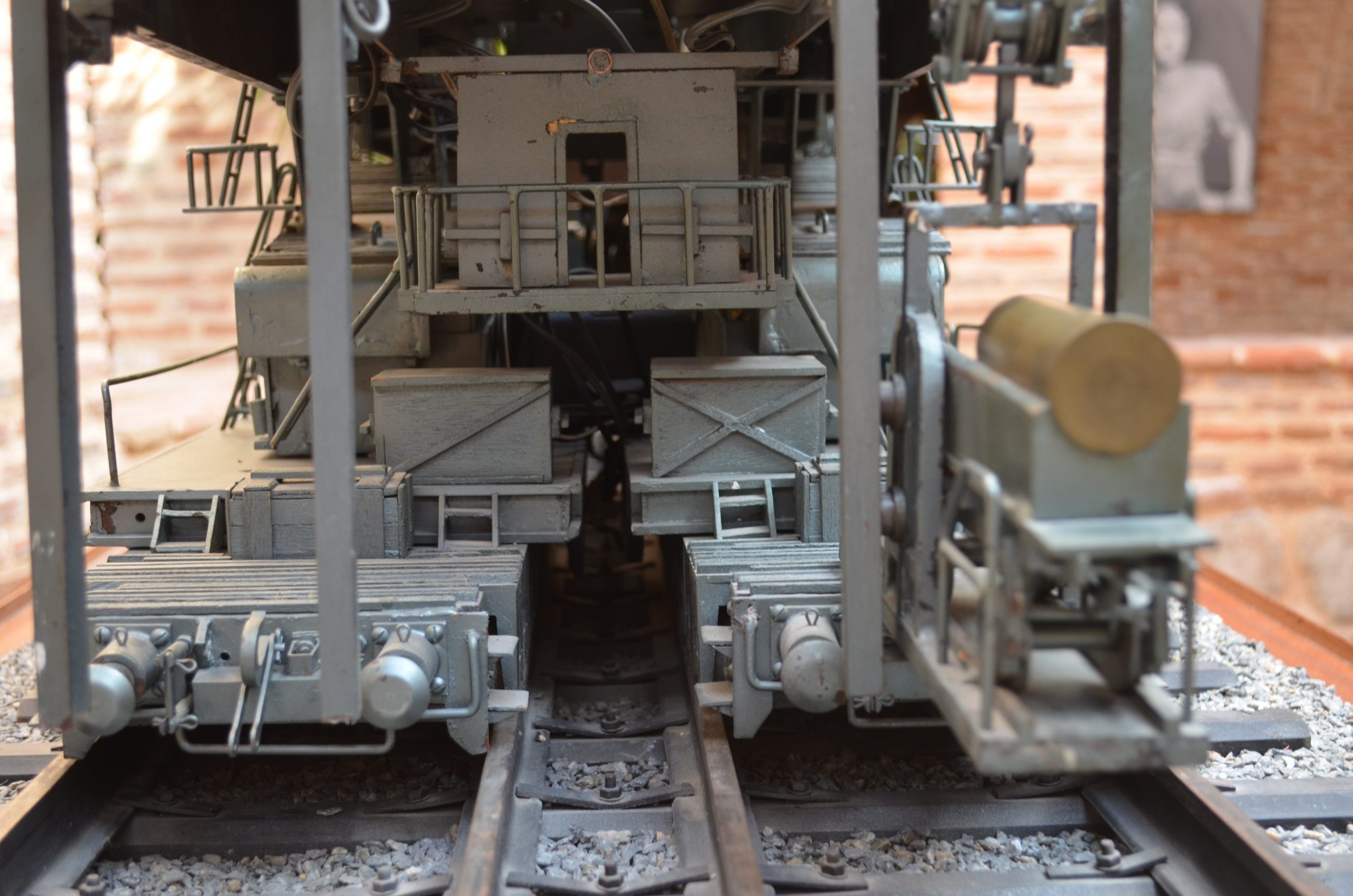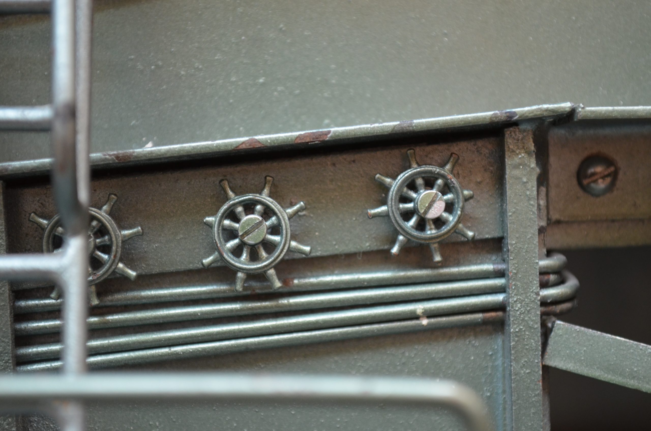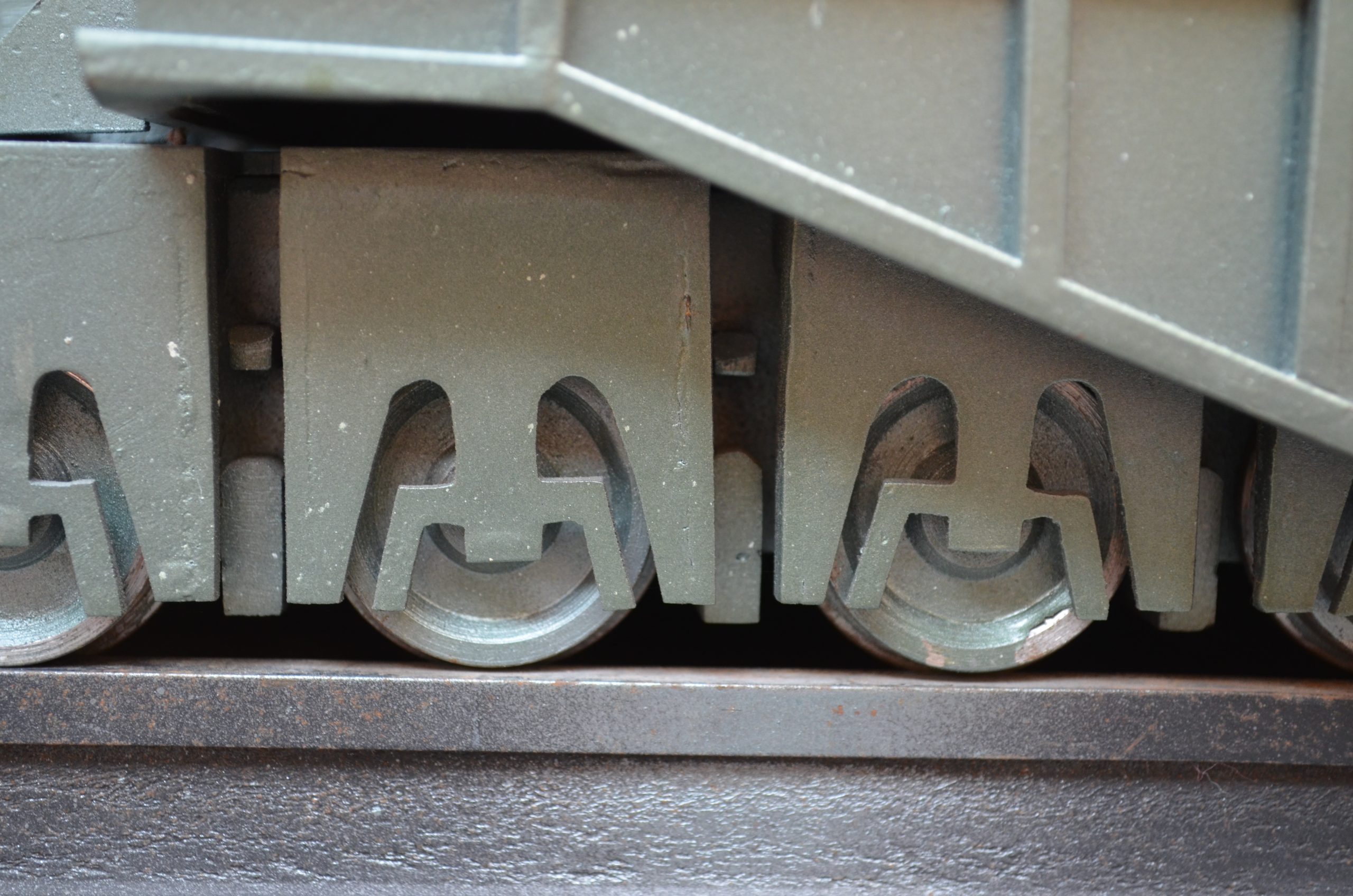 - Tapando cada semicureña hay 3 chapas sujetas con tornillos de 3 mm y tanto en las delanteras como en las traseras hay 2 trampas con el objeto de poder desmontar las vagonetas. En la parte central están los soportes del tubo para apoyar los rodamientos del mismo, los cuales van tapados con las chapas de lo que podríamos llamar el cuñerín, en el cual volvemos a ver varillas de 2 mm, simulando conductos hidráulicos.