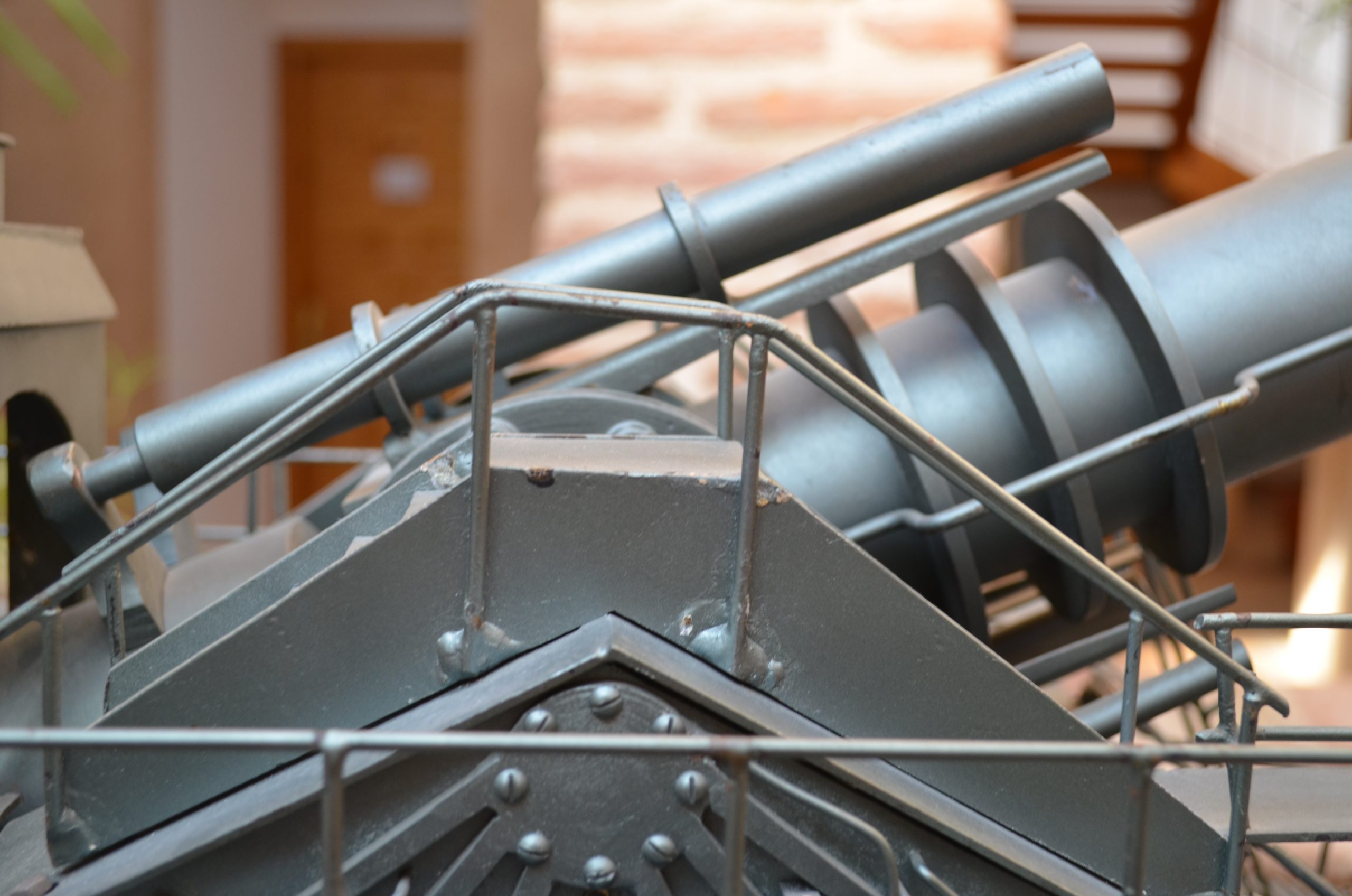 Y finalmente el cierre, la poca historia que hay de la pieza no nos dice como era el cierre original y basado en la práctica de que la mayoría de los cañones del ejército alemán poseían cierres de cuña, supongo que así fuera. Le he simulado un cierre de cuña horizontal, similar al de un 105/26, pero en lugar de hacer el mecanismo interior, pues no tenía medios, lo hice exterior. Para ello rasgué ña parte superior de la tapa de la cuña y con una varilla y un muelle, mediante una biela en V, se acciona el cierre, permitiendo el desplazamiento de la cuña hacia la derecha y a través del muelle se cierra automáticamente.