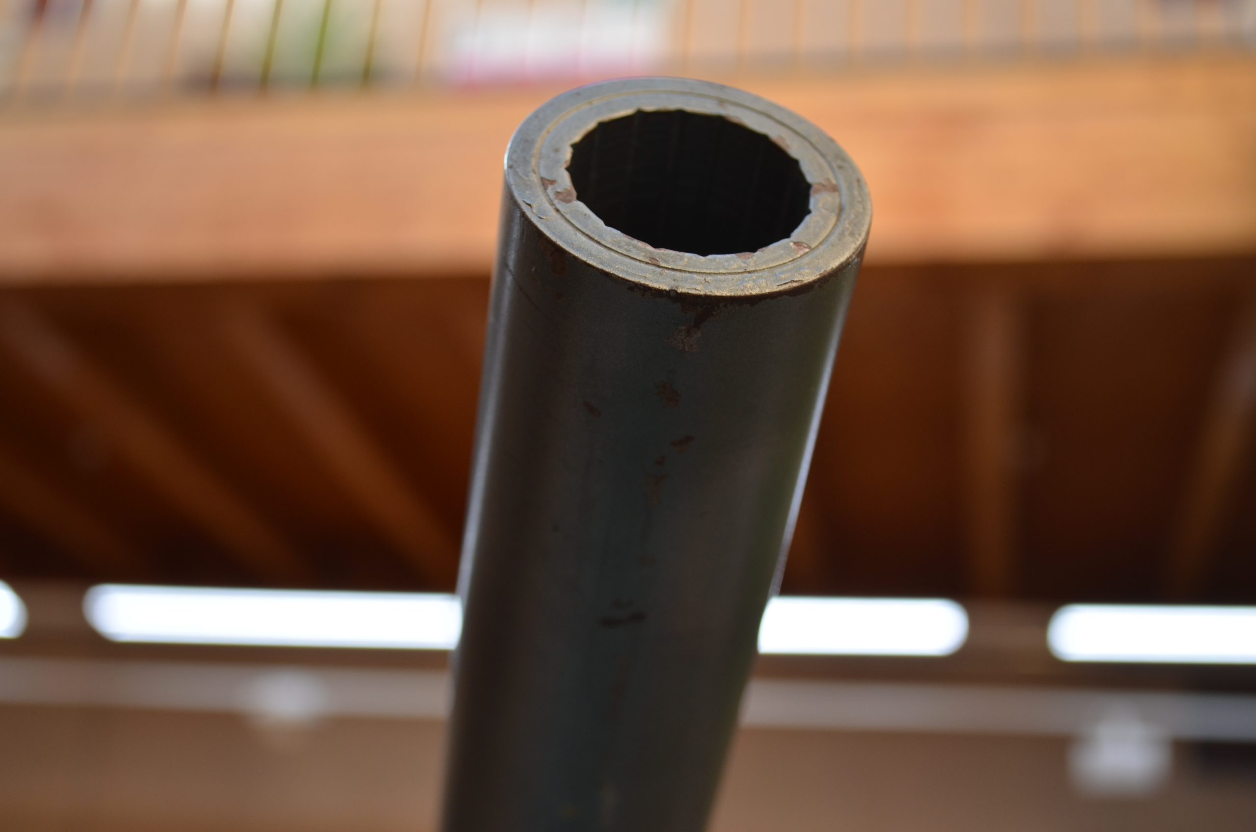 Solamente nos queda por comentar el tubo. Es la pieza que más trabajo me costó. Es un tubo monobloque, que era una varilla maciza de 90 mm que fue necesaria perforarla en toda su longitud. Esta operación se hizo en torno demasiado pequeño para esta longitud y fue necesario invertir los términos, me explico: cuando se trata de barrenar una pieza, como en este caso, es la pieza la que da vueltas en el cabezal del torno, estando fija la broca en el punto del torno, pues bien, en este caso no se pudo hacer esta maniobra, sino que fue la broca la que se puso en cabezal del torno y la pieza se sujetó mediante dos lunetas y el carro del torno y se fue perforando de 5 en 5 mm para desahogar la broca. Se consiguió perforar la varilla en toda su longitud. En esta operación se invirtieron 42 h de trabajo en días sucesivos.