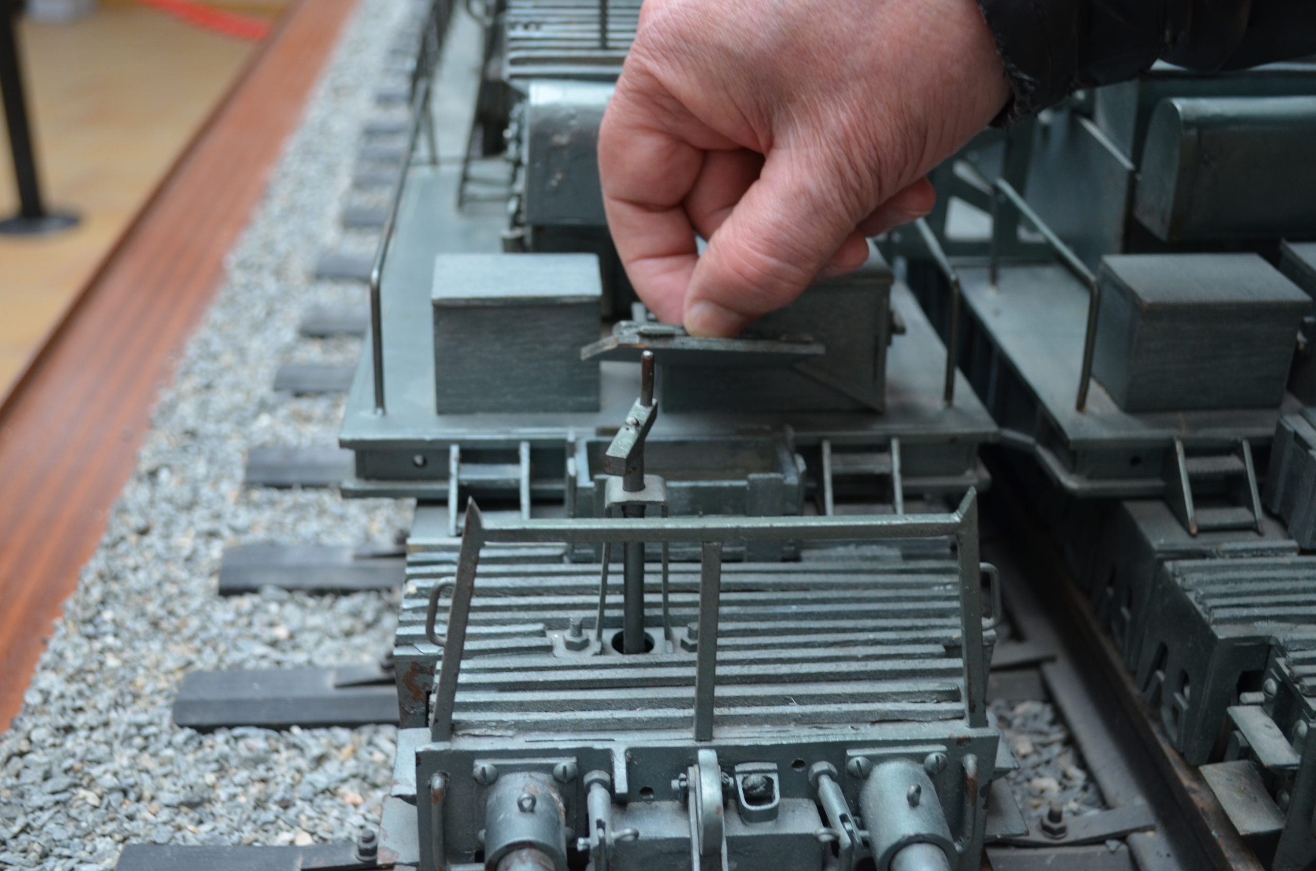 En el frente de cada vagoneta tiene dos topes ferroviarios, estos topes tiene un muelle interior para que haga la función de amortiguación. Los frenos, con su correspondiente manivela, que mediante un piñón y una corona dentada dan movimiento a las varillas simulando los frenos. Todo ello va tapado con chapa de 150 mm a modo de carrocería de la vagoneta. Hay también, a cada lado de la parte delantera, unas escaleras de acceso a la parte superior, están hechas de chavetero de 6 x 6 mm y sujetas con cuatro tornillos de 3 mm.