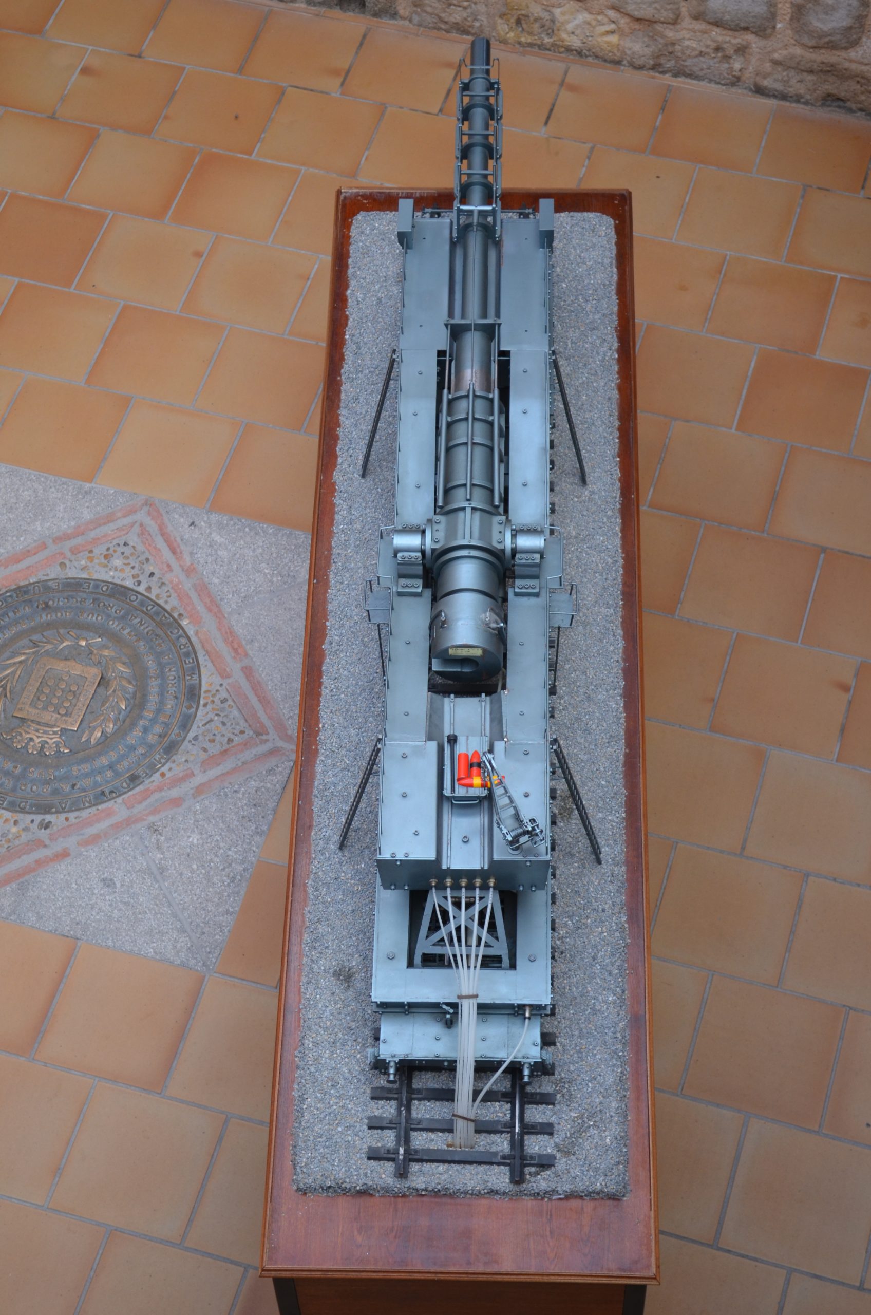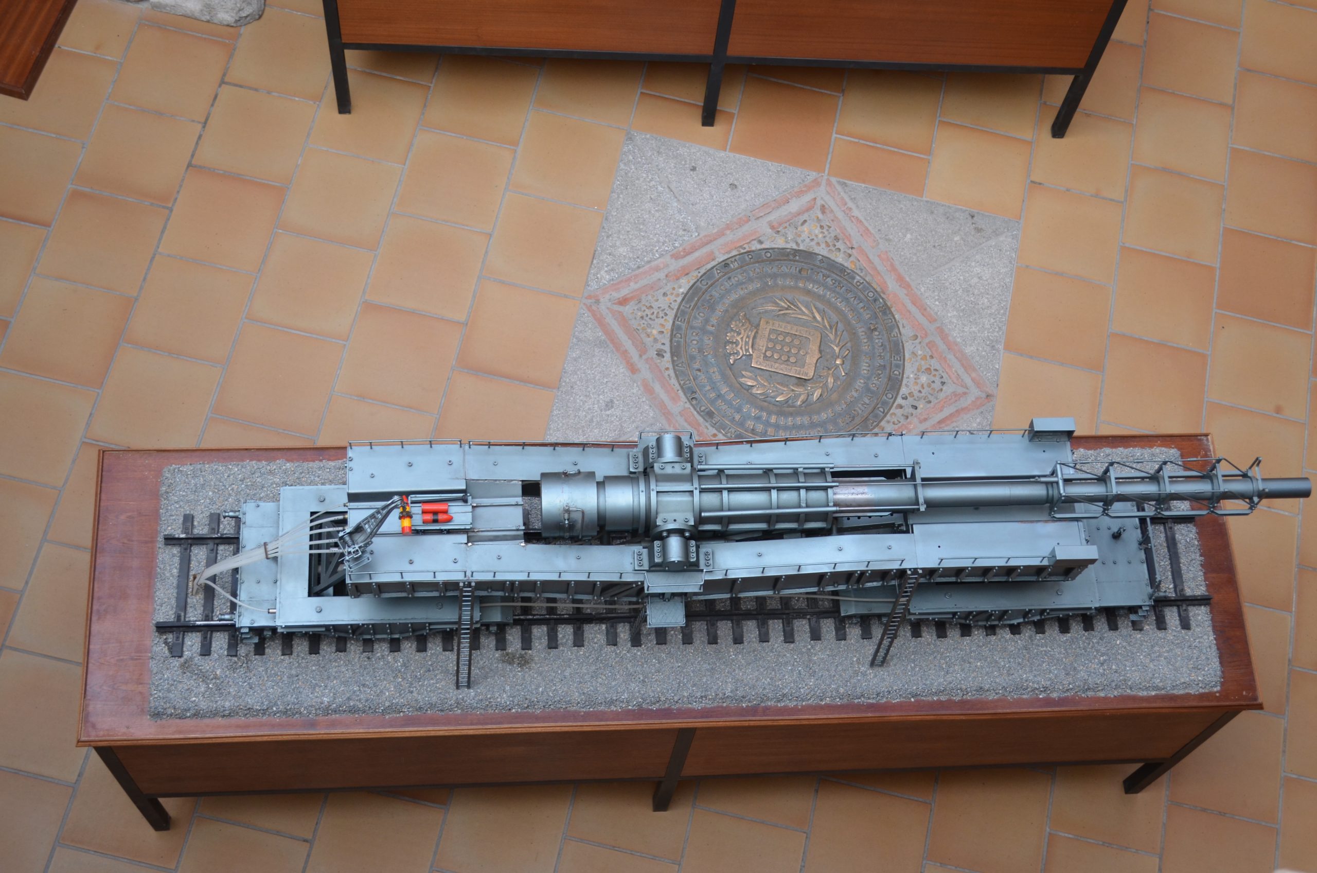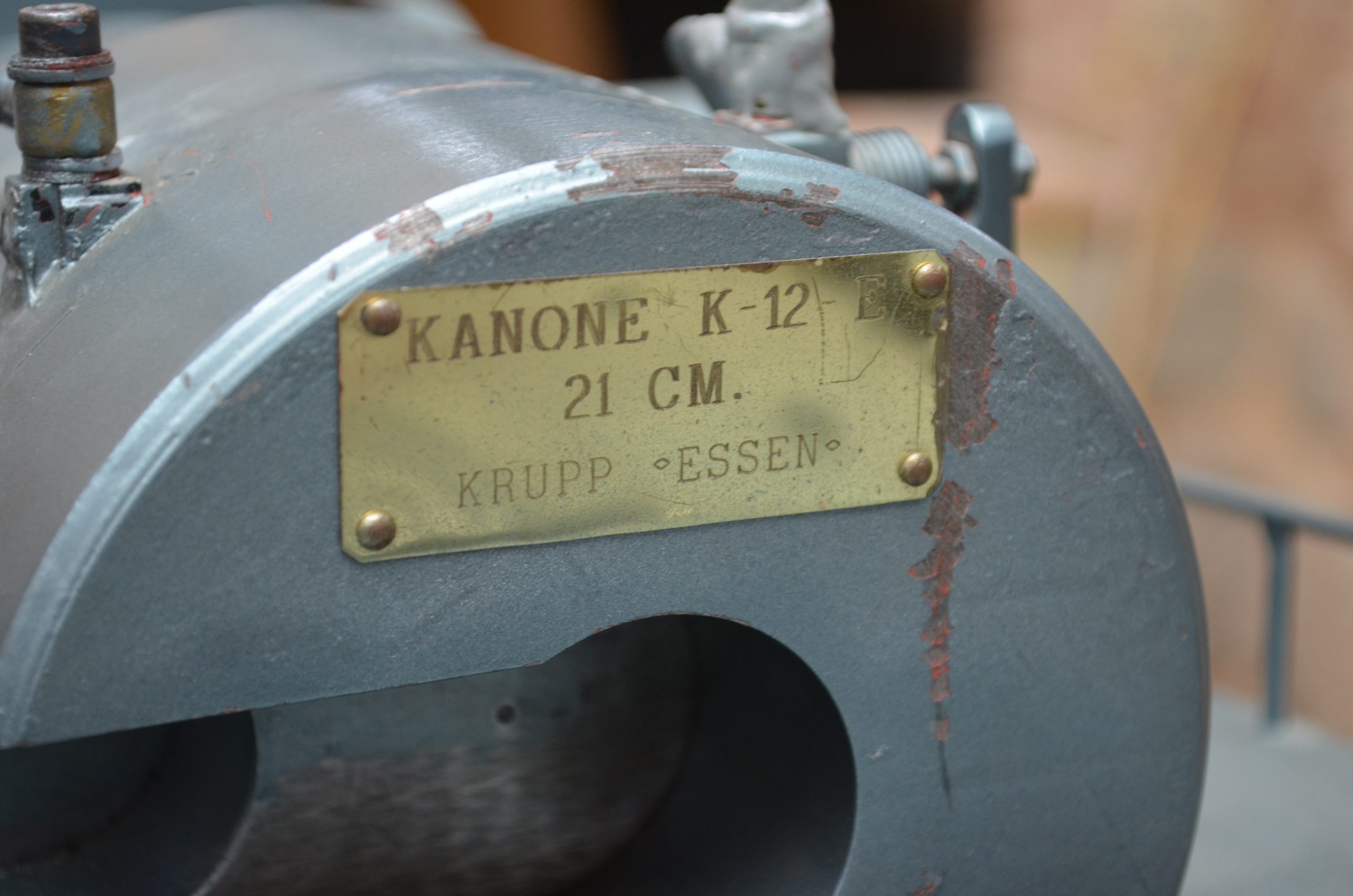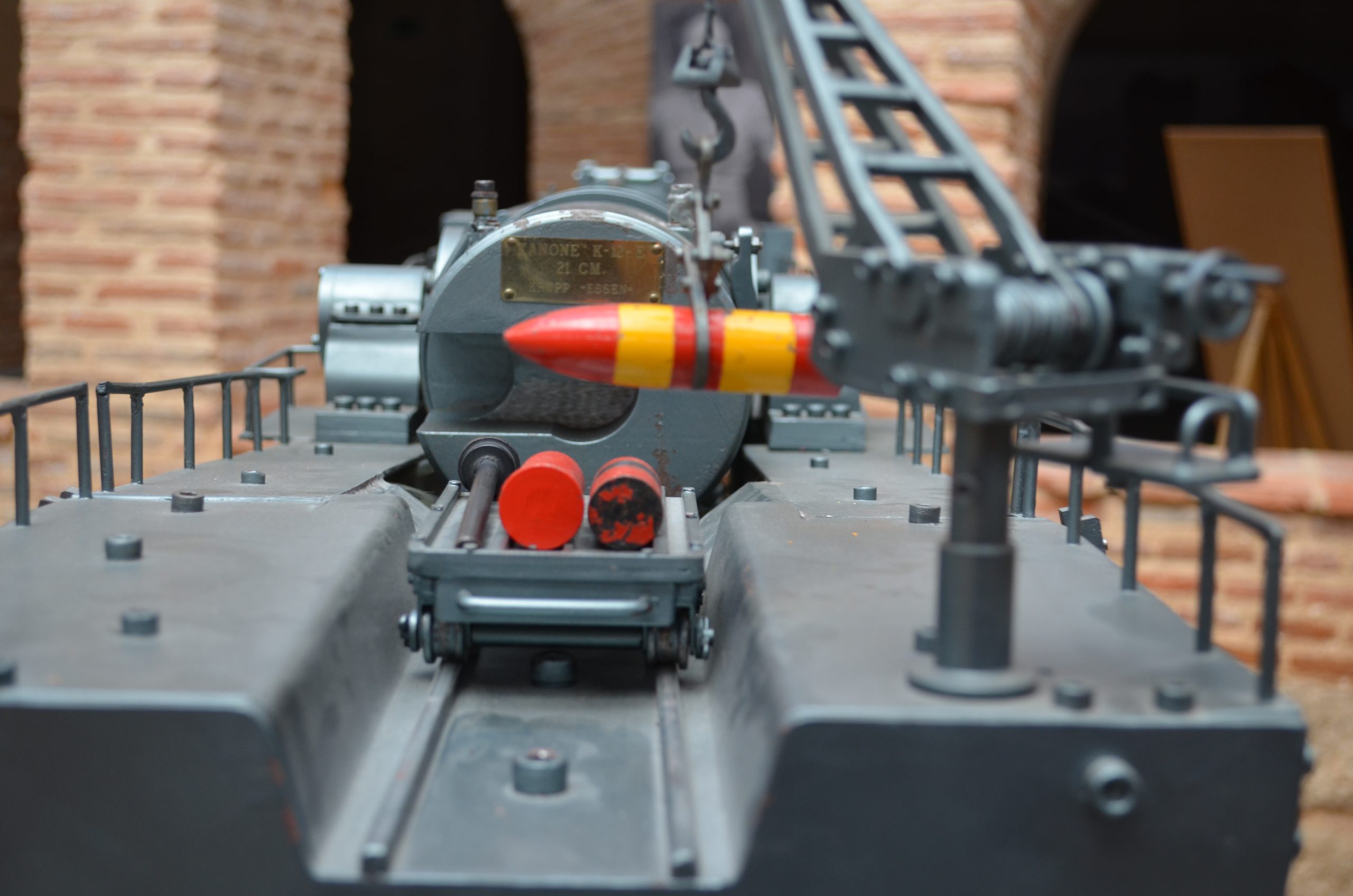 El cañón de largo alcance K 12 (E) tenía un alcance de 115 km y con una munición subcalibrada conseguía un alcance máximo de 140 km. Esta vista trasera muestra el largo tubo y la protección para no curvarse con su propio peso (réplica del cañón que se usó contra París que estuvo manejado por artilleros navales). El proyecto fue diseñado por el profesor Ransemberger, con un sistema doble de retroceso de aire comprimido y, con este sistema, el retroceso era tan solo de 98 cm. La idea original de estos cañones de largo alcance incrementando la velocidad de tiro, la cual lanzaba el proyectil hasta la estratosfera donde el escaso aire dejaba las bombas a mayor distancia, resultando que el alcance era superior a los 100 km.