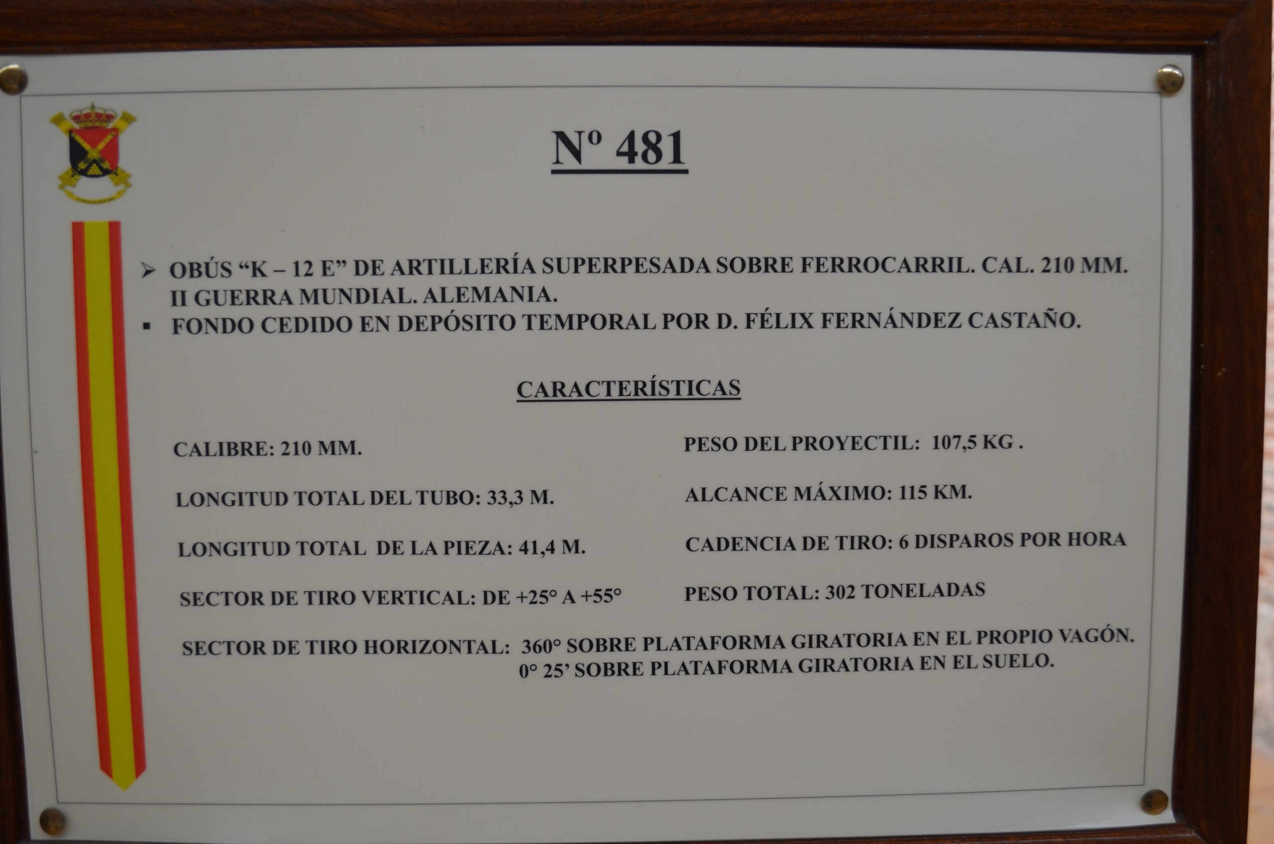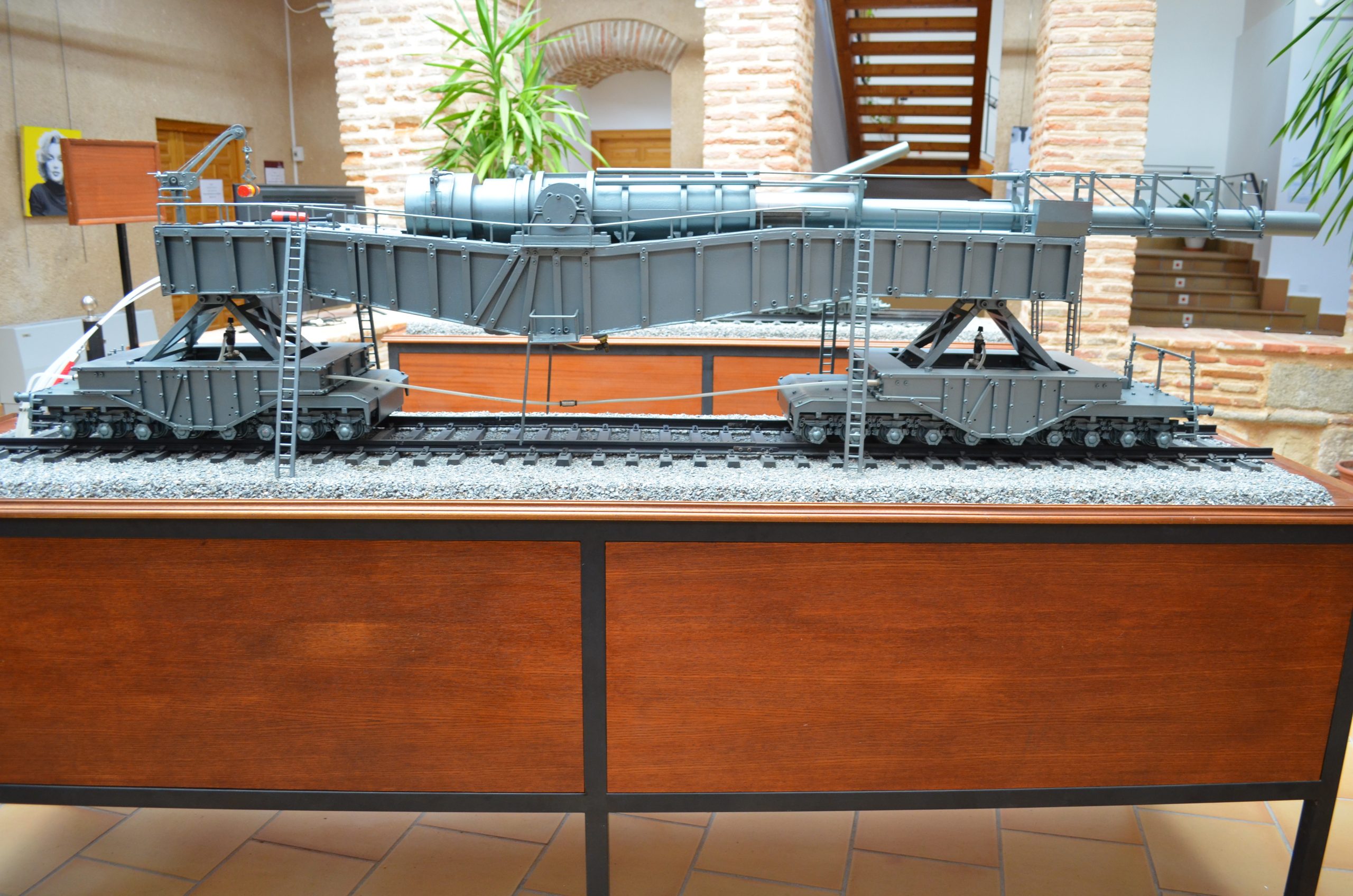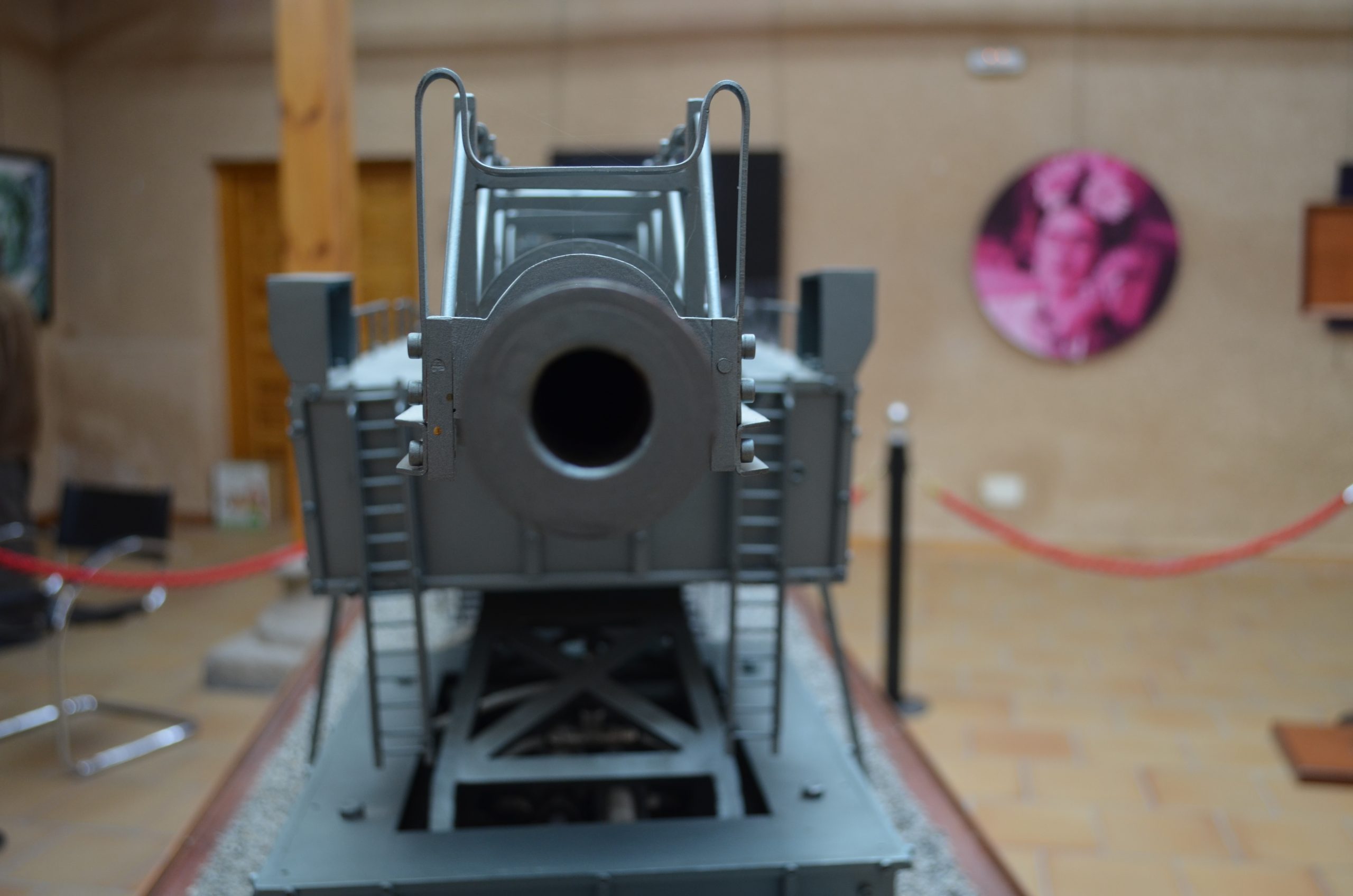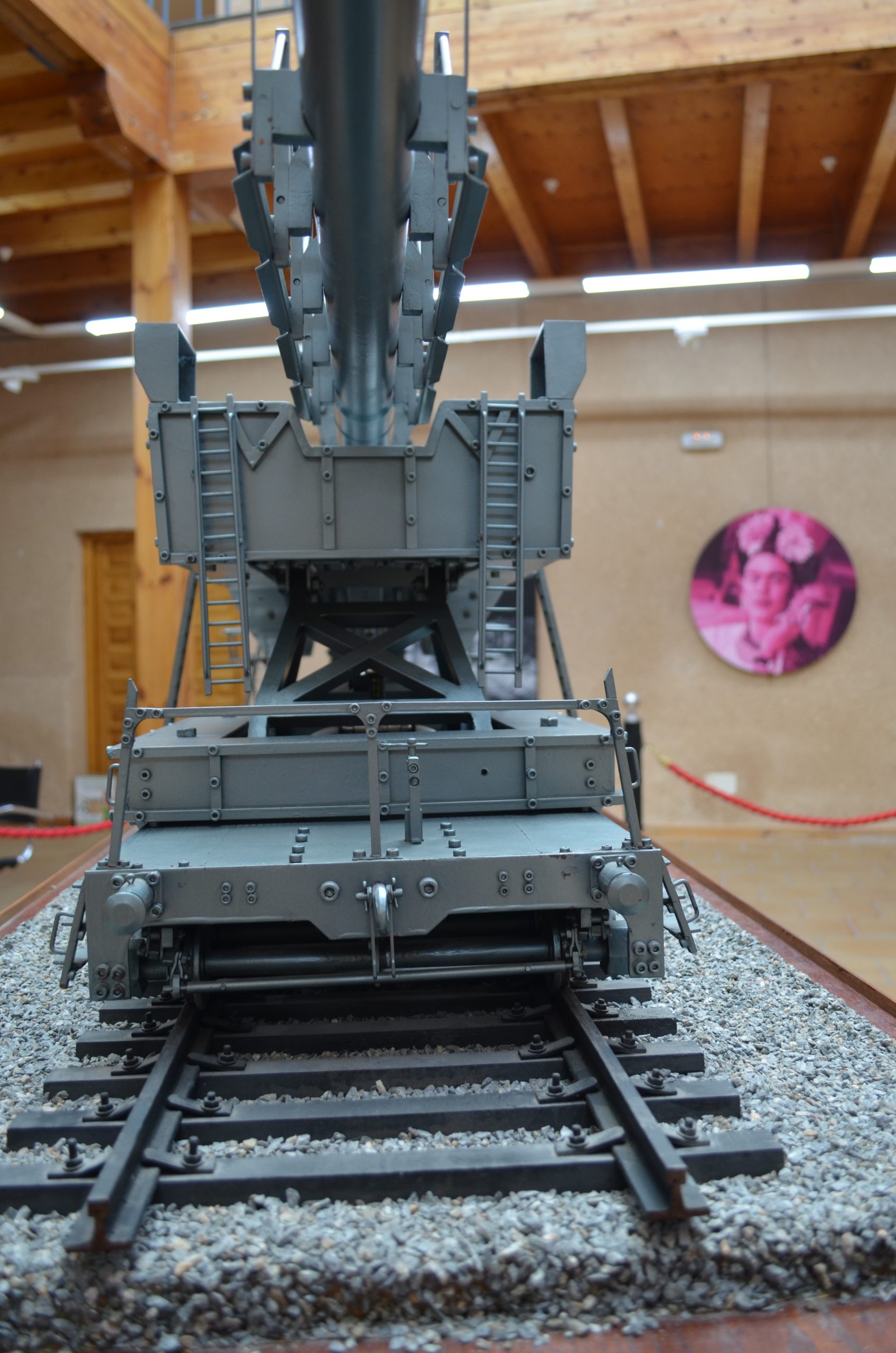 El cañón de largo alcance K 12 (E) tenía un alcance de 115 km y con una munición subcalibrada conseguía un alcance máximo de 140 km. Esta vista trasera muestra el largo tubo y la protección para no curvarse con su propio peso (réplica del cañón que se usó contra París que estuvo manejado por artilleros navales). El proyecto fue diseñado por el profesor Ransemberger, con un sistema doble de retroceso de aire comprimido y, con este sistema, el retroceso era tan solo de 98 cm. La idea original de estos cañones de largo alcance incrementando la velocidad de tiro, la cual lanzaba el proyectil hasta la estratosfera donde el escaso aire dejaba las bombas a mayor distancia, resultando que el alcance era superior a los 100 km.