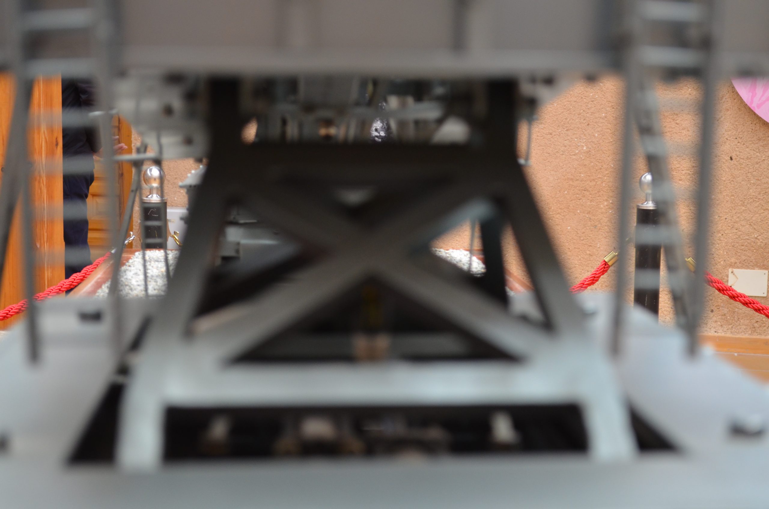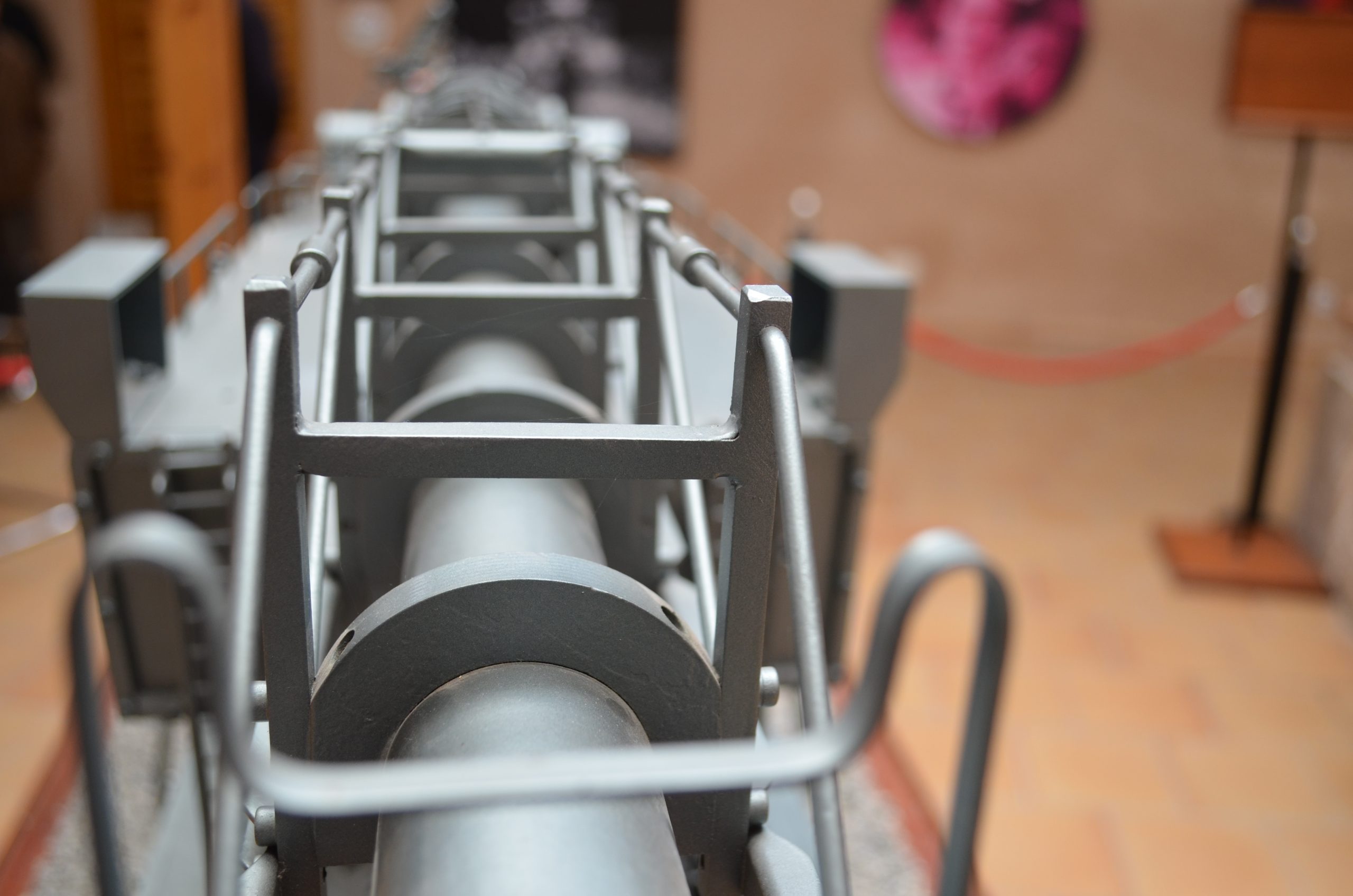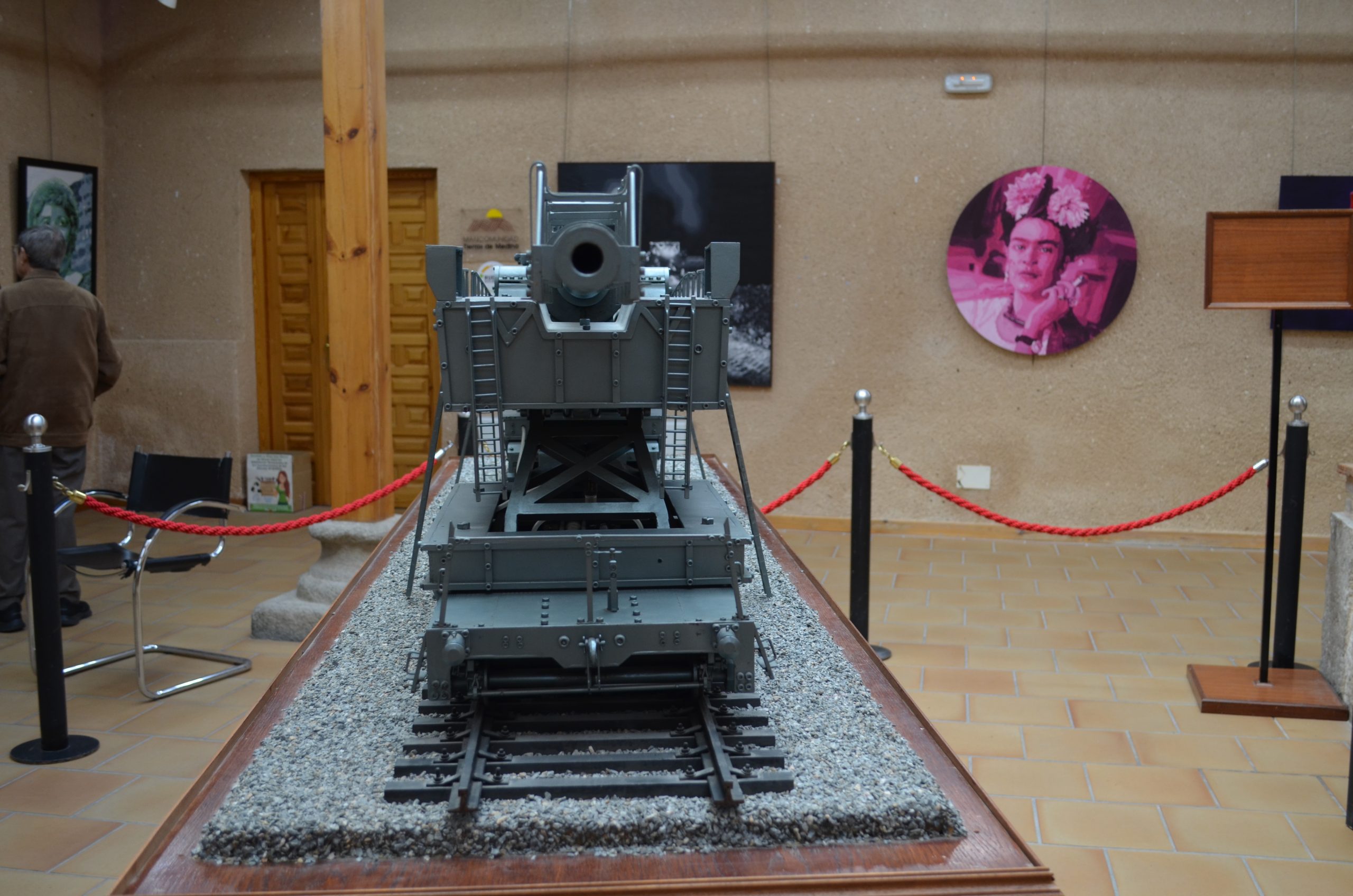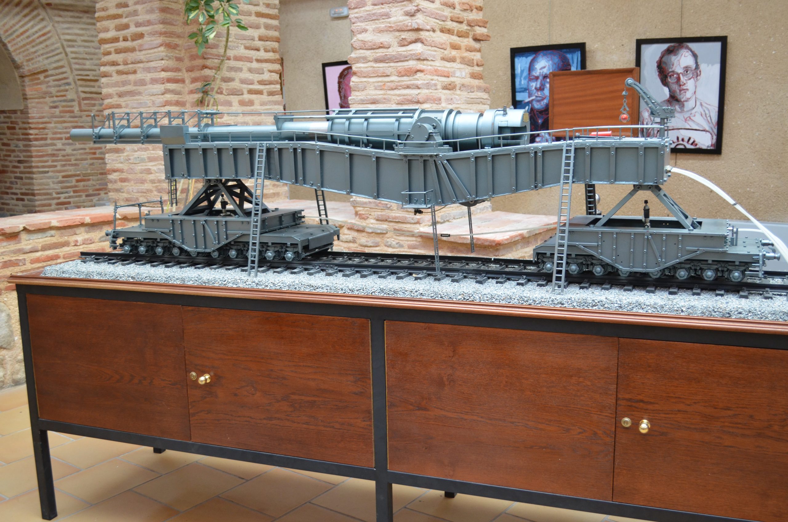 El cañón de largo alcance K 12 (E) tenía un alcance de 115 km y con una munición subcalibrada conseguía un alcance máximo de 140 km. Esta vista trasera muestra el largo tubo y la protección para no curvarse con su propio peso (réplica del cañón que se usó contra París que estuvo manejado por artilleros navales). El proyecto fue diseñado por el profesor Ransemberger, con un sistema doble de retroceso de aire comprimido y, con este sistema, el retroceso era tan solo de 98 cm. La idea original de estos cañones de largo alcance incrementando la velocidad de tiro, la cual lanzaba el proyectil hasta la estratosfera donde el escaso aire dejaba las bombas a mayor distancia, resultando que el alcance era superior a los 100 km.