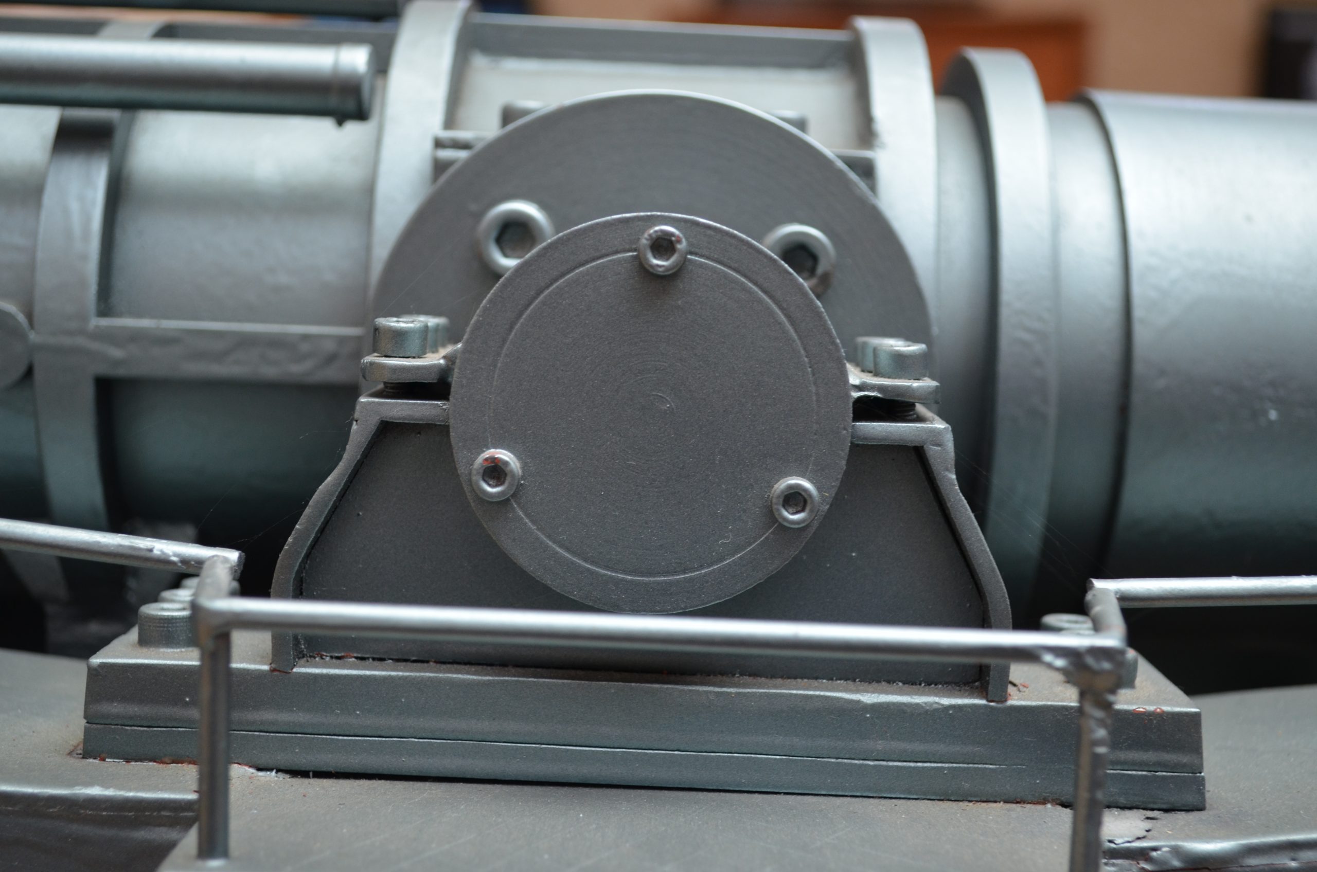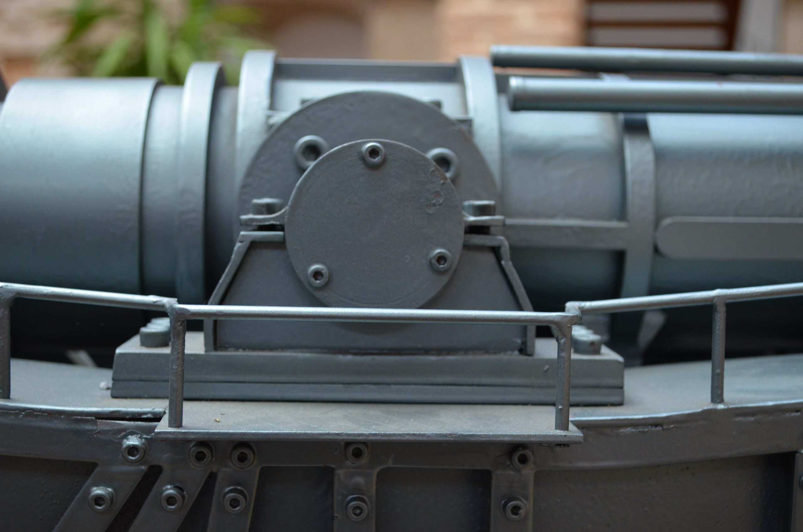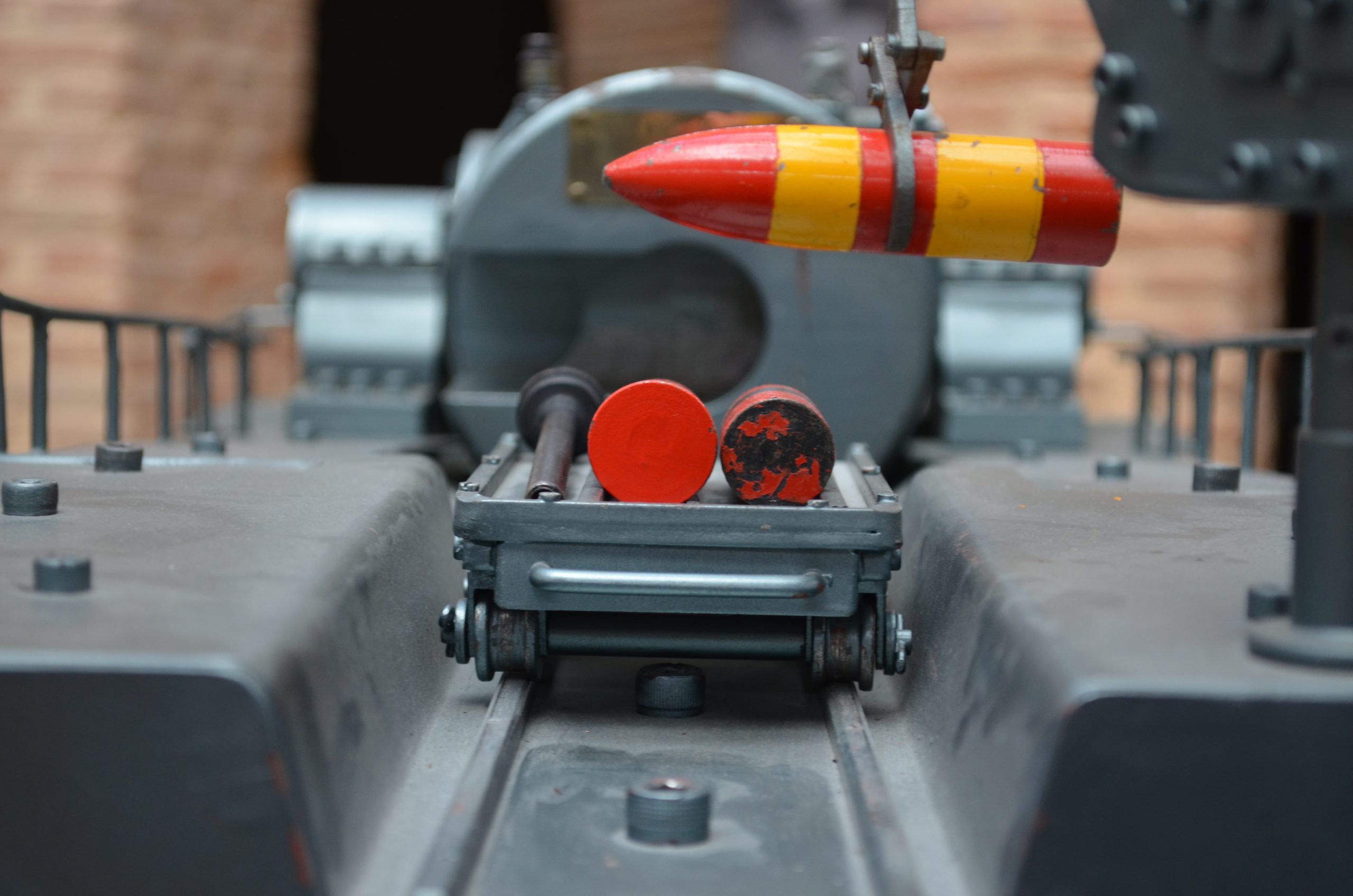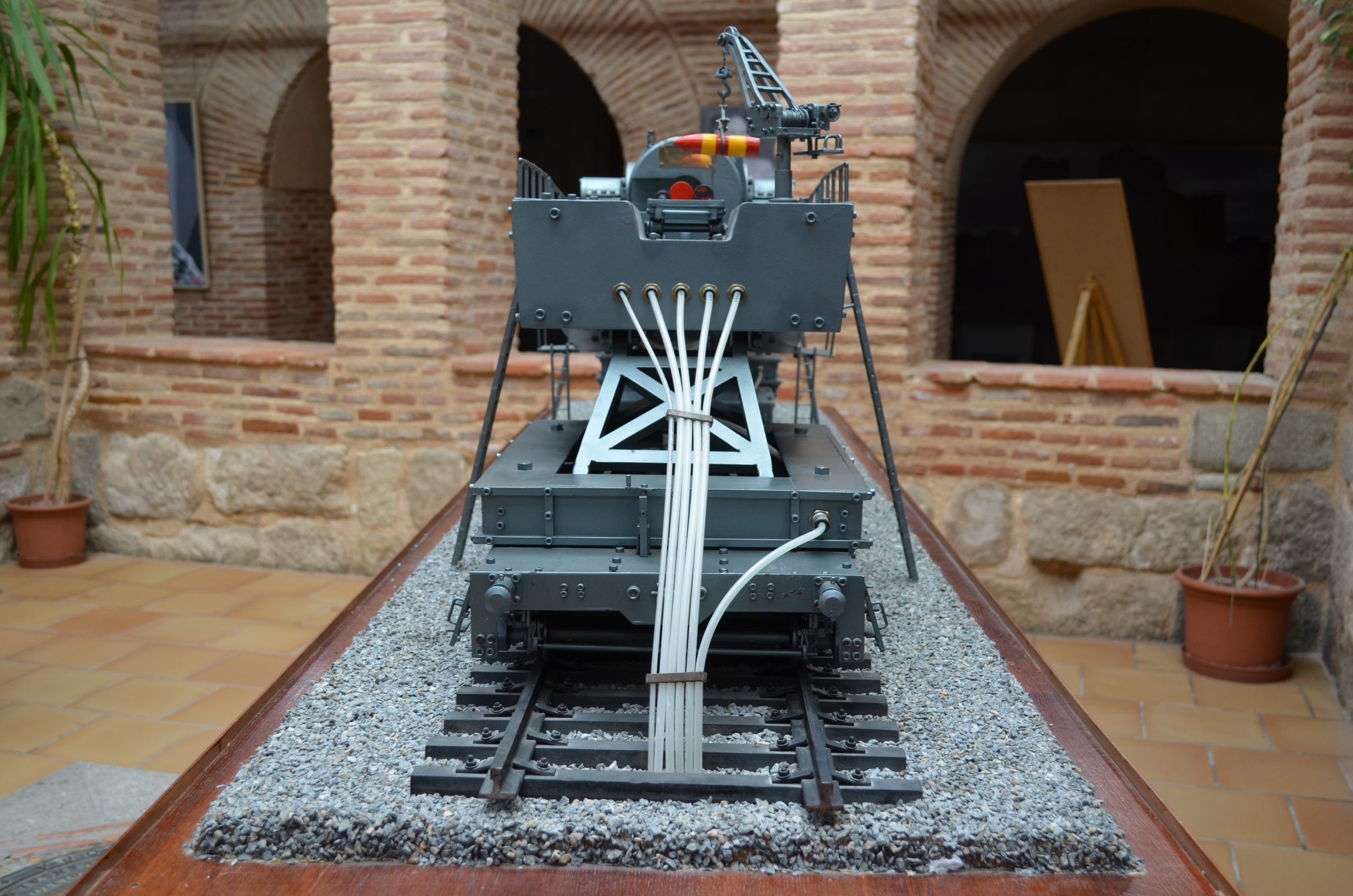 - A la pieza había que municionarla y supongo que había laguna grúa para esa labor, los documentos que tengo no me revelan nada acerca de eso, me he tomado la libertad de ponerle una grúa en la parte posterior de la plataforma con una vagoneta portamuniciones.