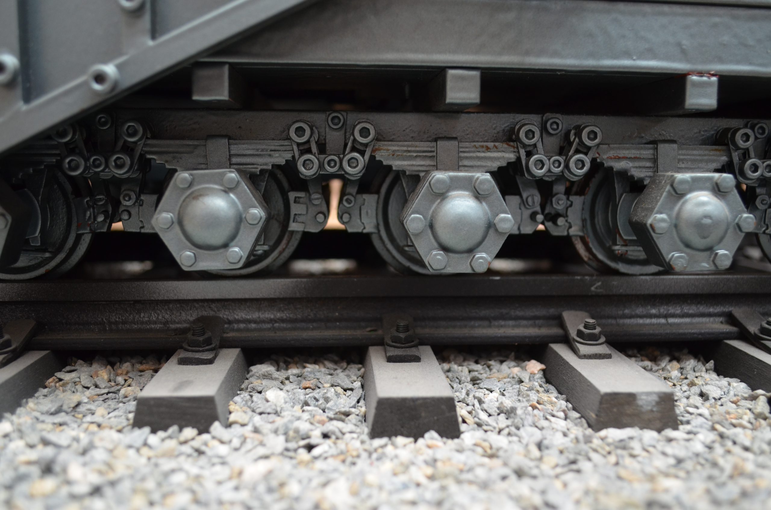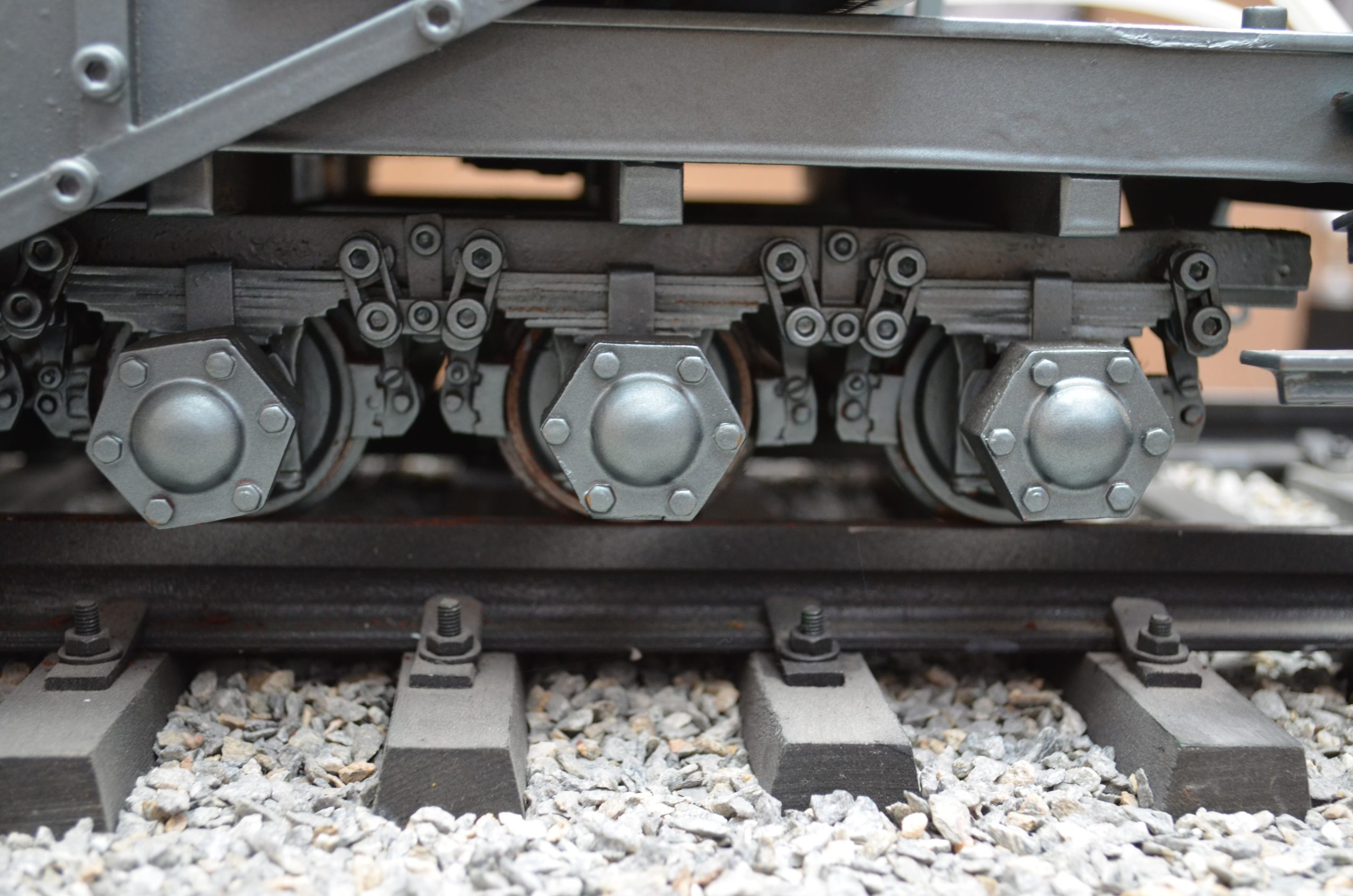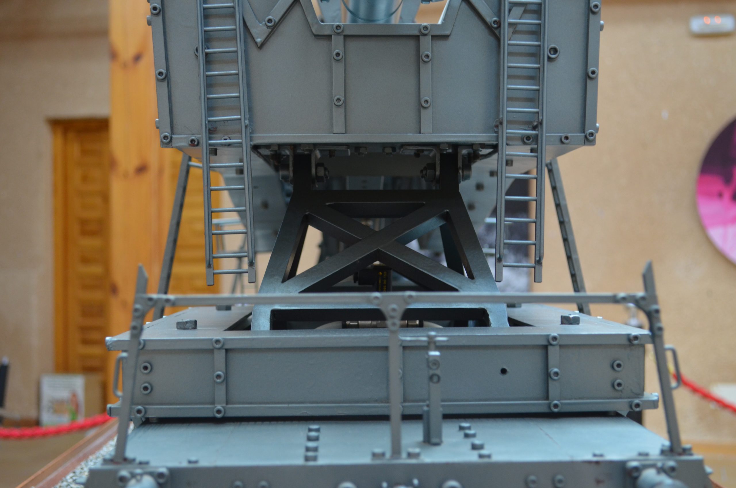 Consta de dos góndolas o plataformas ferroviarias, la delantera con diez ejes y la trasera con ocho. ¿Por qué una diez y la otra ocho? Seguramente sea debido a que la delantera tiene que soportar más peso, y que gran parte del tubo descansa sobre la parte delantera. Cada eje lleva en sus extremos dos casquillos de latón presurizado, uno en cada rueda, haciendo la función de rodamientos. Cada rueda tiene su ballesta, que consta de diez hojas, su abarcón y su capuchino. Las hojas de estas ballestas son chapas normales, no tienen flecha hacia ningún lado pues simulan que la góndola está soportando todo el peso del cañón y van unidas entre sí por un sistema de ochos que les permiten bascular unas sobre otras según las irregularidades de los carriles. Cada rueda tiene dos zapatas de frenado, unidas de lado a lado por el triángulo, así se llama ferroviariamente, y una timonería que une todos los triángulos y mediante un husillo, situado en la parte superior de la vagoneta, simula la acción de frenado. La acción de frenado, en principio se pensó en que debían hacerla dos cilindros neumáticos de 6 u 8 mm, hubo que desestimarla por no encontrar un cilindro de tan reducidas dimensiones para poder acoplarlo, el sistema existe, pero no actúa.