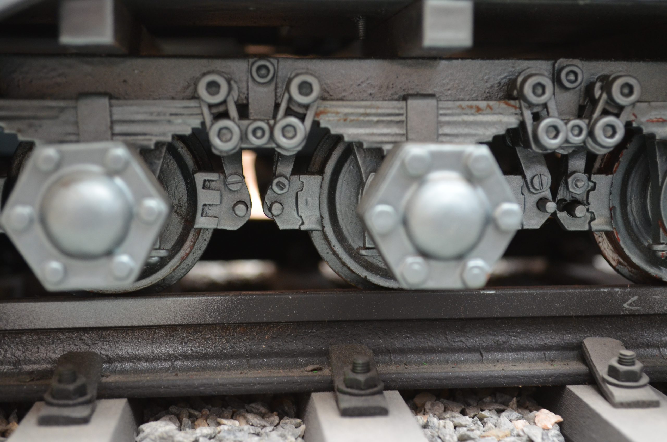 La otra cosa a comentar es la vía. He tenido que hacer un raíl de dos piezas, una T de 25 mm rebajada 10 mm en su altura y simulando la cabeza del raíl una chaveta de 8 x8 con una ranura de 3 mm , metida a presión en la T. La sujeción del raíl a la traviesa seguramente no sea como la original, a falta de otros informes, me he limitado a hacer una pestaña con un tornillo en la traviesa que le da presión y sujeta el raíl a la traviesa.